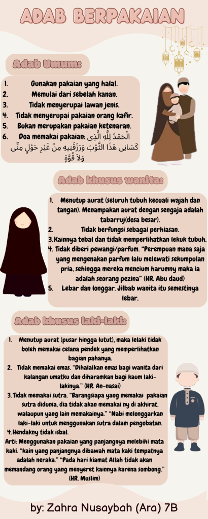 DiniyahAdab zahra / October 24, 2024 Infografis Adab Berpakaian Adab Berpakaian is an infographic that contains the manners of dressing, starting from general manners of dressing,