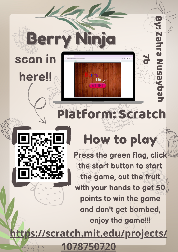 So this is the 6th game that I made in semester 1. Berry Ninja game is a game that is played by cutting berries by using your hands or anything. There are 30 seconds to get 50 points to win the game, each berries the point is different and don’t cut the bomb. Enjoy the game!!!
